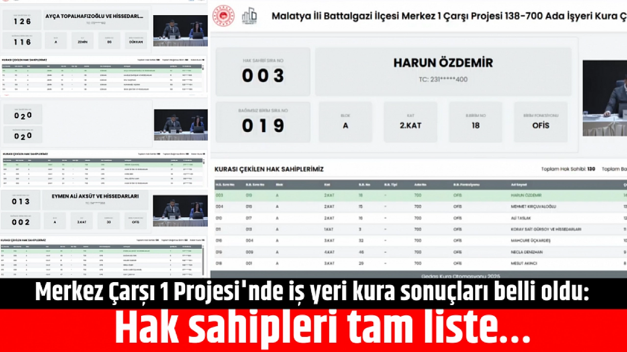 Malatya'da 6 Şubat 2023'teki depremlerde yıkılan veya ağır hasar gören ve yapımı tamamlanan konutların kurası çekiliyor. Merkez Çarşı 1 projesi kapsamında 700 ve 138 Ada'nın iş yeri kura çekimi sonuçları belli oldu.