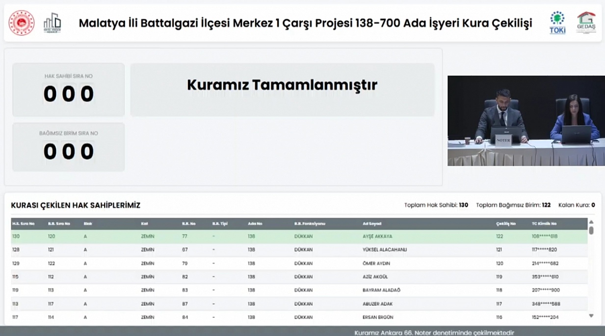 Malatya'da 6 Şubat 2023'teki depremlerde yıkılan veya ağır hasar gören ve yapımı tamamlanan konutların kurası çekiliyor. Merkez Çarşı 1 projesi kapsamında 700 ve 138 Ada'nın iş yeri kura çekimi sonuçları belli oldu.