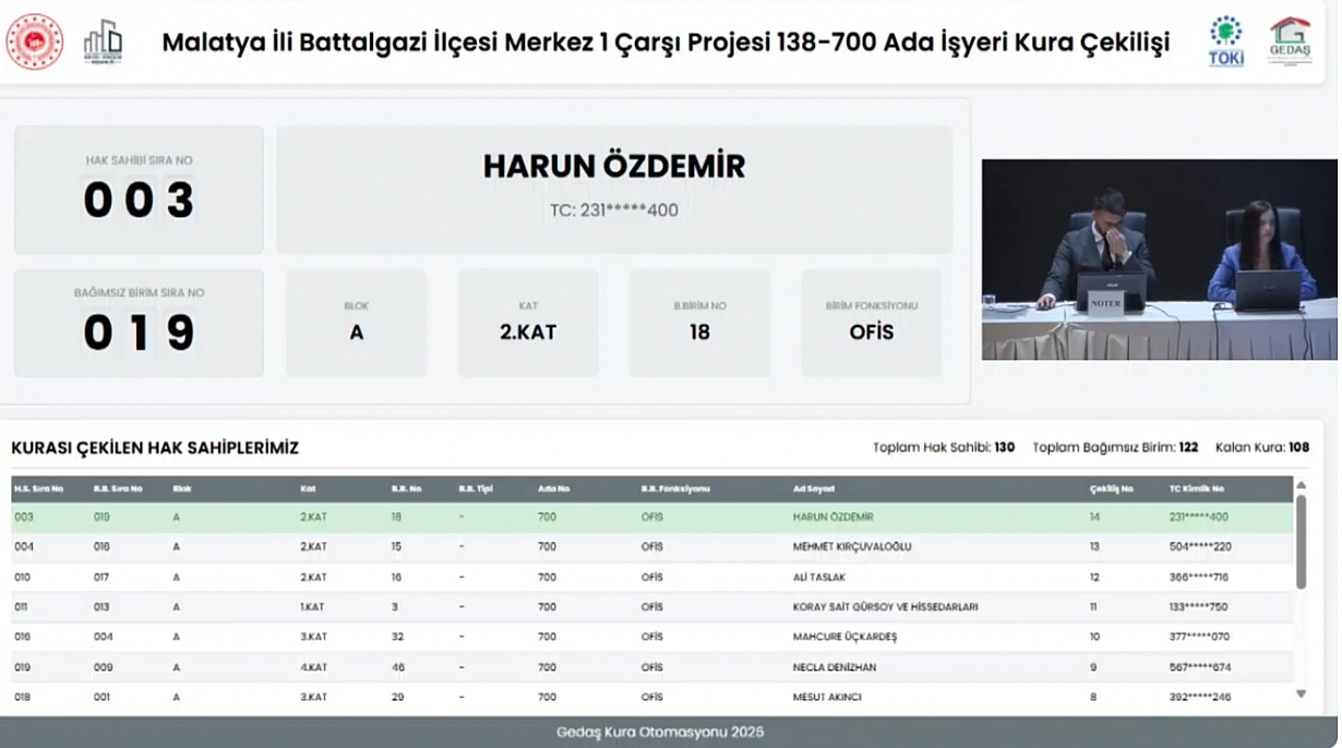 Malatya'da 6 Şubat 2023'teki depremlerde yıkılan veya ağır hasar gören ve yapımı tamamlanan konutların kurası çekiliyor. Merkez Çarşı 1 projesi kapsamında 700 ve 138 Ada'nın iş yeri kura çekimi sonuçları belli oldu.