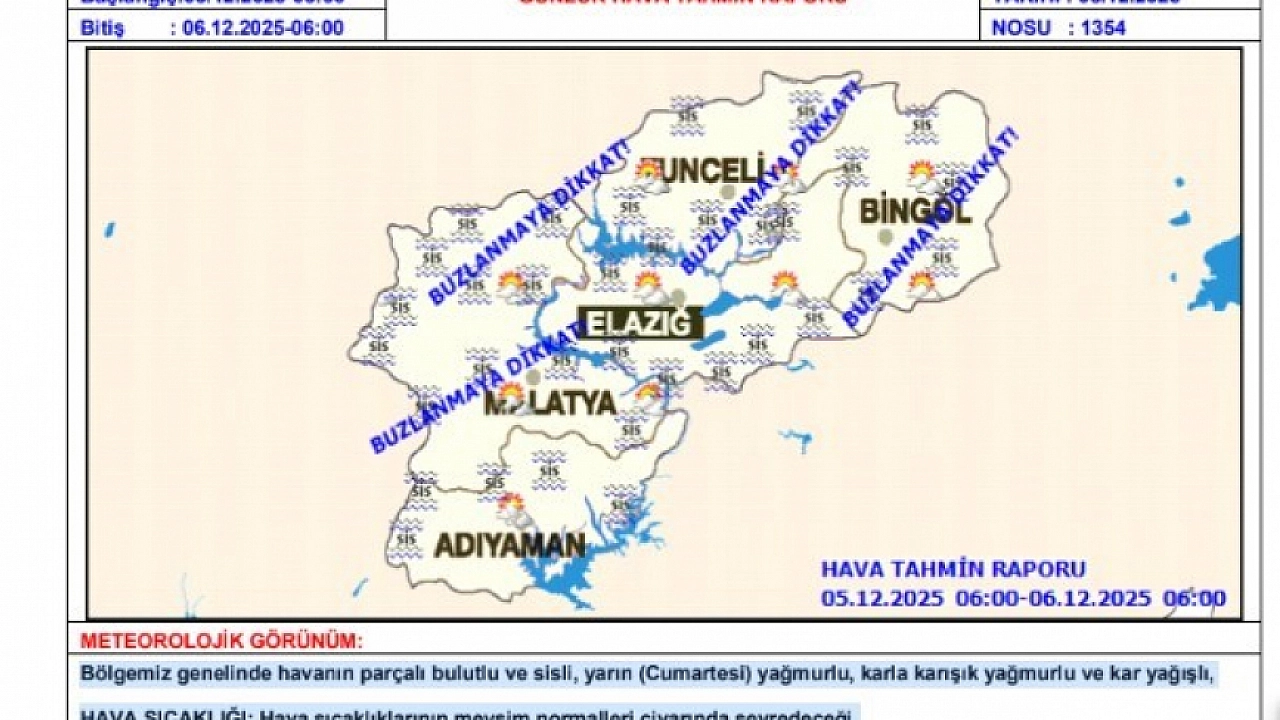 Meteoroloji 13. Bölge Müdürlüğü, hafta sonu Elazığ için karla karışık yağmur ve kar yağışı uyarısı yaptı.