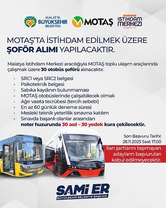 Malatya Büyükşehir Belediyesi'ne bağlı MOTAŞ, şehir içi toplu ulaşımda görev yapmak üzere 30 otobüs şoförü istihdam edeceğini duyurdu.