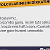 MOTAŞ'tan yapılan açıklamada, 29 Ekim Çarşamba gününün resmi tatil olması sebebiyle araçların hafta sonu uygulanan Cumartesi günü sefer listesine göre hizmet vereceği belirtildi.