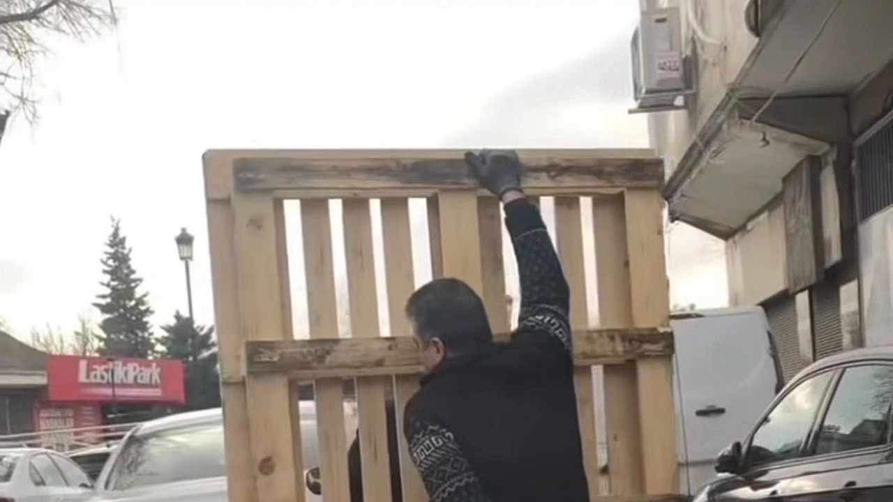 Gaziantep'te yoğun trafikte motosiklet üzerinde tehlikeli şekilde palet taşınma anları cep telefonu kamerasına yansıdı.