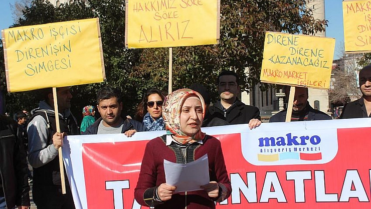 Makro Market mağdurları adına basın açıklaması yapan Neslihan Yıldırım, “22 Ocak 2019 tarihinde yaptığımız basın açıklamasında da belirttiğimiz gibi makro market 2017 yılı Ekim ayında konkordato ilan etmiş ve akabinde mağazaları tek tek kapatmıştı. 6 bin 500 işçi işten çıkartılmıştı, uzun bir zaman geçmesine rağmen hâlâ işçilerin kıdem ihbar tazminatı ödenmedi. Ankara Kayseri Konya Mersin de de her hafta basın açıklaması yaparak sesimizi duyurduk. Nakliyat-İs sendikası makro mağdurlarına sahip çıkarak, isçilerin güçlü bir şekilde mücadele etmesini sağladı. 24 Aralık, 2018 tarihinde Ankara'da makro genel merkezinde yaklaşık binin üzerinde makro market mağdurlarının katılımı ile bir eylem yaptık. Bu tarihe kadar biz isçileri yok sayan hiç bir açıklama yapmayan makro market yönetim kurulu ve konkordato komiseri bize Konya AVM gayrimenkulünün ipoteğinin kalkması sonucu satışı gerçekleştiği takdirde yada Migros’a devredilen mağazalar karşılığında aylık makro tarafına yapılan ödemeler ile tazminatlarımızın ödeneceğinin sözünü aldık” dedi. Bilirkişi raporundan umutlu olduklarını ifade eden Yıldırım, “İşçilerin haklarını konkordato mahkemesi değerlendirecek, Nakliyat İs sendikası önderliğinde verdiğimiz mücadelenin sonucu yıllık izin ücreti alacağı olan makro market mağdurlarının yıllık izin ücretleri makro market tarafından ödendi. İsçiler olarak direnişimizden sonuç almaya başladık. Makro market yönetim kurulunun aynı hassasiyeti tazminat haklarımız için de göstermelerini talep ederek, makro isçilerinin tazminat hakları olumlu sonuçlanana kadar, tazminatlarımız hesabımıza yatana kadar mücadeleye devam edeceğiz” şeklinde konuştu. Mağdurlar, yapılan açıklamanın ardından, “Kıdem tazminatı yasal haktır gasp edilemez. İşçilerin birliği sermayeyi yenecek” gibi sloganlar atarak olaysız bir şekilde dağıldılar.