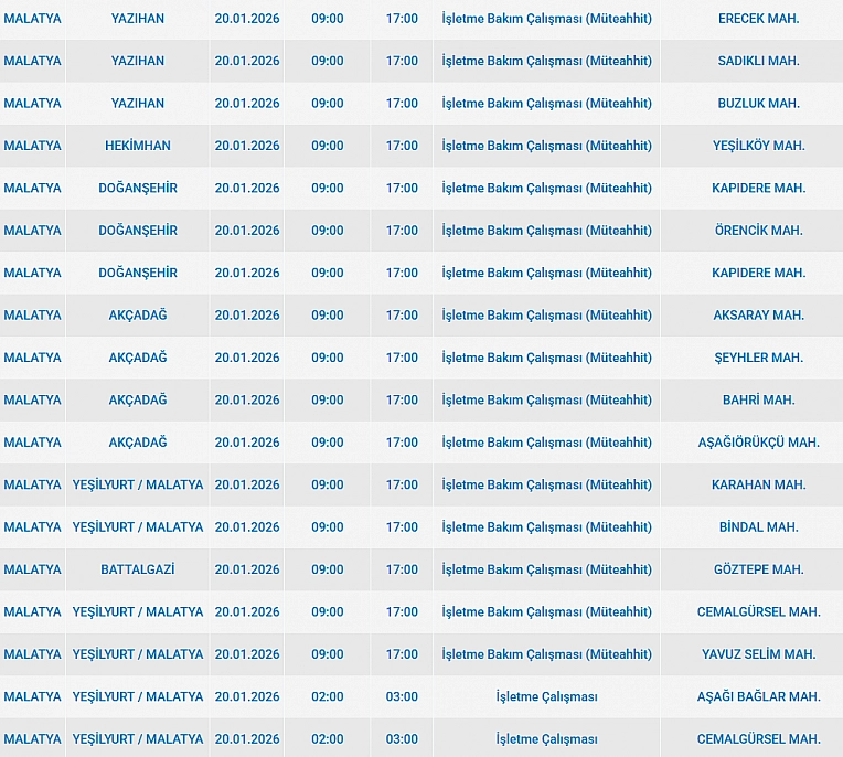 Malatya'da 20 Ocak 2025 Salı günü Hekimhan, Darende, Battalgazi, Yeşilyurt, Yazıhan, Akçadağ, Doğanşehir ilçelerinde planlı bakım çalışmaları nedeniyle elektrik kesintisi yaşanacak. İşte elektrik kesintisi yaşayacak mahalleler…