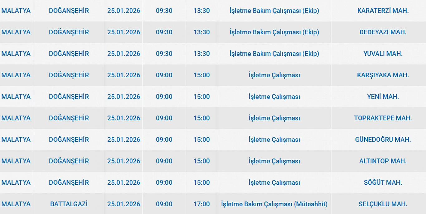 Malatya'da 25 Ocak 2025 Pazar günü Doğanşehir, Battalgazi ilçelerinde planlı bakım çalışmaları nedeniyle elektrik kesintisi yaşanacak. İşte elektrik kesintisi yaşayacak mahalleler…