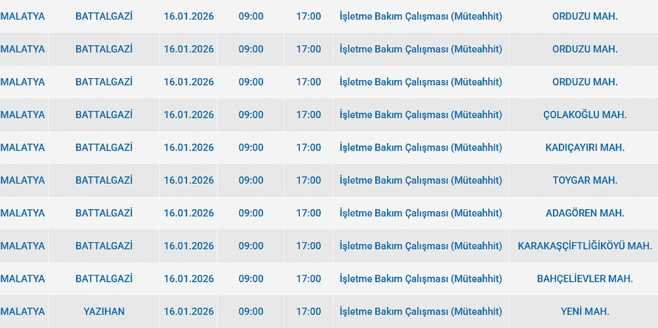 Malatya'da 16 Ocak 2025 Cuma günü Yazıhan, Battalgazi ilçelerinde planlı bakım çalışmaları nedeniyle elektrik kesintisi yaşanacak. İşte elektrik kesintisi yaşayacak mahalleler…