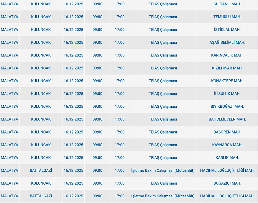 Malatya'da 16 Aralık 2025 Salı günü Akçadağ, Pütürge, Darende, Battalgazi, Yeşilyurt, Hekimhan, Kuluncak ilçelerinde planlı bakım çalışmaları nedeniyle elektrik kesintisi yaşanacak. İşte elektrik kesintisi yaşayacak mahalleler…