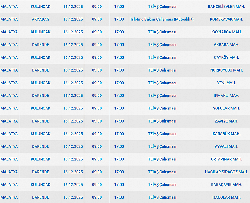 Malatya'da 16 Aralık 2025 Salı günü Akçadağ, Pütürge, Darende, Battalgazi, Yeşilyurt, Hekimhan, Kuluncak ilçelerinde planlı bakım çalışmaları nedeniyle elektrik kesintisi yaşanacak. İşte elektrik kesintisi yaşayacak mahalleler…