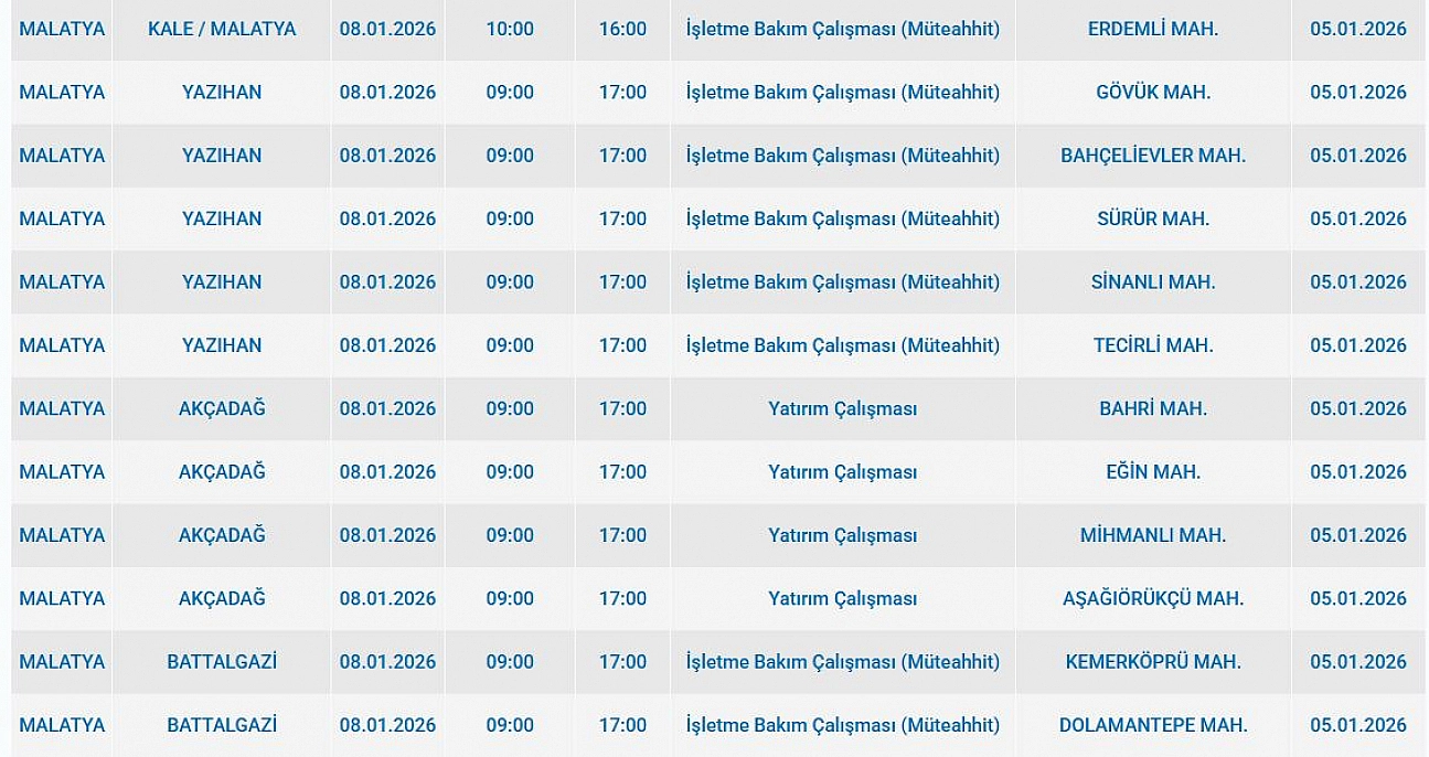 Malatya'da 8 Ocak 2025 Perşembe günü Kale, Akçadağ, Yazıhan, Battalgazi ilçelerinde planlı bakım çalışmaları nedeniyle elektrik kesintisi yaşanacak. İşte elektrik kesintisi yaşayacak mahalleler…