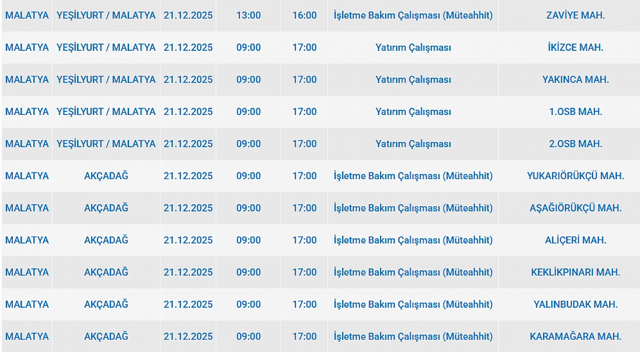 Malatya'da 21 Aralık 2025 Pazar günü Yeşilyurt, Akçadağ, Darende ilçelerinde planlı bakım çalışmaları nedeniyle elektrik kesintisi yaşanacak. İşte elektrik kesintisi yaşayacak mahalleler…