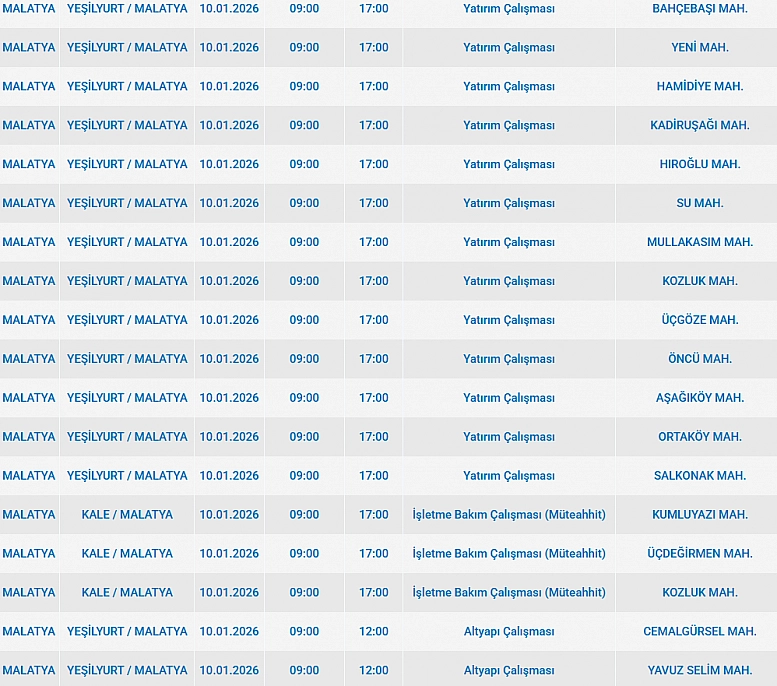 Malatya'da 10 Ocak 2025 Cumartesi günü Yeşilyurt, Kale, Battalgazi ilçelerinde planlı bakım çalışmaları nedeniyle elektrik kesintisi yaşanacak. İşte elektrik kesintisi yaşayacak mahalleler…