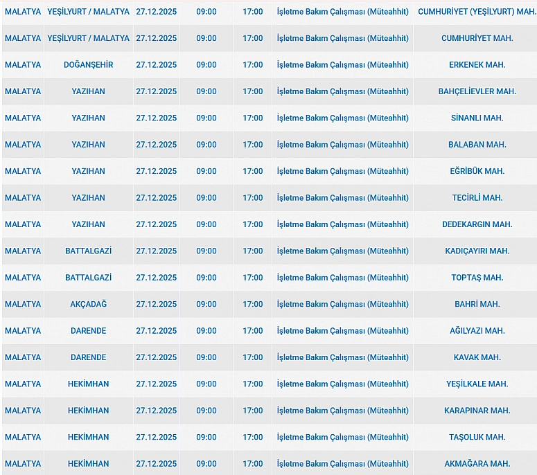 Malatya'da 27 Aralık 2025 Cumartesi günü Hekimhan, Darende, Akçadağ, Battalgazi, Yazıhan, Doğanşehir, Yeşilyurt ilçelerinde planlı bakım çalışmaları nedeniyle elektrik kesintisi yaşanacak. İşte elektrik kesintisi yaşayacak mahalleler…