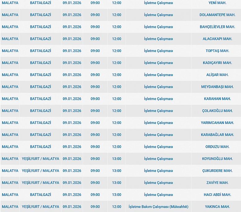 Malatya'da 9 Ocak 2025 Cuma günü Yeşilyurt, Battalgazi, Yazıhan, Kale ilçelerinde planlı bakım çalışmaları nedeniyle elektrik kesintisi yaşanacak. İşte elektrik kesintisi yaşayacak mahalleler…