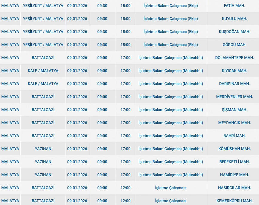 Malatya'da 9 Ocak 2025 Cuma günü Yeşilyurt, Battalgazi, Yazıhan, Kale ilçelerinde planlı bakım çalışmaları nedeniyle elektrik kesintisi yaşanacak. İşte elektrik kesintisi yaşayacak mahalleler…