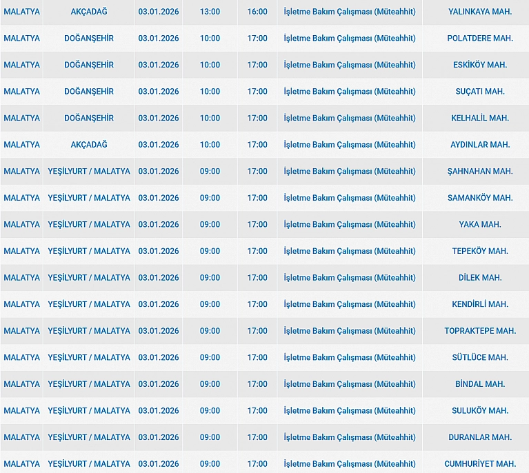 Malatya'da 2 Ocak 2025 Cumartesi günü Akçadağ, Battalgazi, Doğanşehir, Yazıhan, Yeşilyurt ilçelerinde planlı bakım çalışmaları nedeniyle elektrik kesintisi yaşanacak. İşte elektrik kesintisi yaşayacak mahalleler…