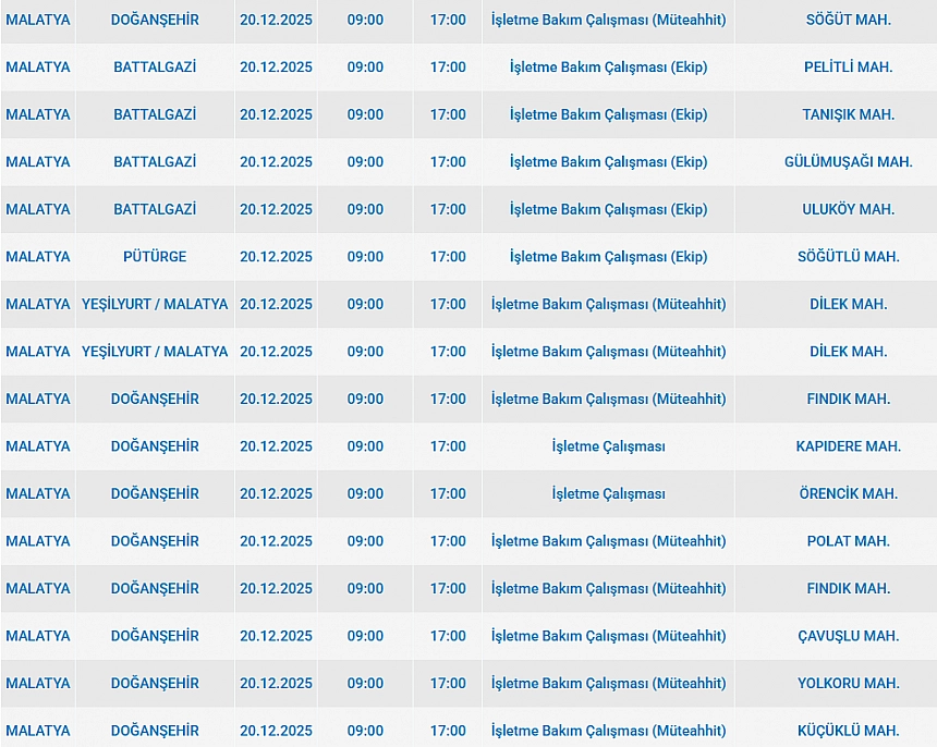Malatya'da 20 Aralık 2025 Cumartesi günü Doğanşehir, Yeşilyurt, Pütürge, Battalgazi, Kuluncak, Darende, Akçadağ, ilçelerinde planlı bakım çalışmaları nedeniyle elektrik kesintisi yaşanacak. İşte elektrik kesintisi yaşayacak mahalleler…