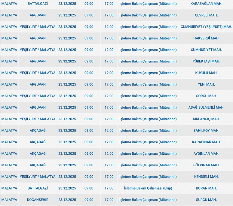 Malatya'da 23 Aralık 2025 Salı günü Doğanşehir, Yeşilyurt, Battalgazi, Akçadağ, Arguvan, Yazıhan, Hekimhan, Kuluncak ilçelerinde planlı bakım çalışmaları nedeniyle elektrik kesintisi yaşanacak. İşte elektrik kesintisi yaşayacak mahalleler…