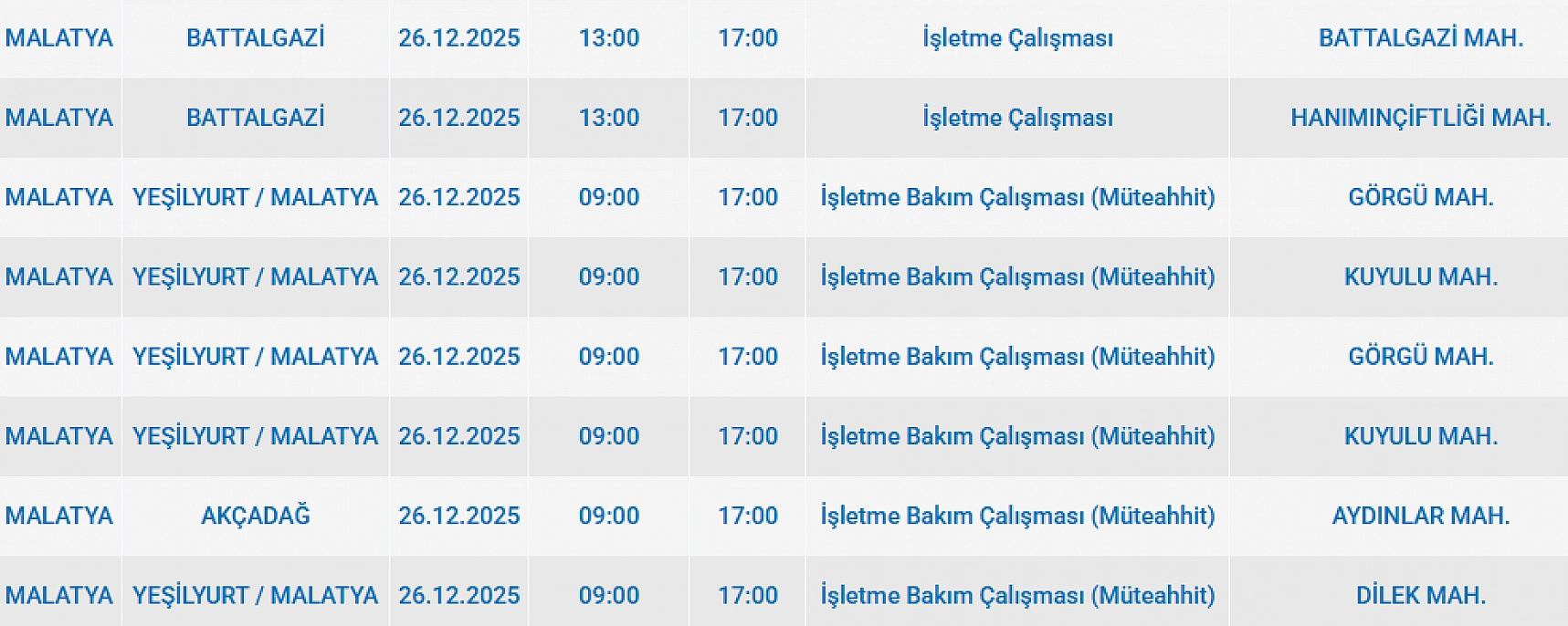 Malatya'da 26 Aralık 2025 Cuma günü Battalgazi, Doğanşehir, Yazıhan, Yeşilyurt, Hekimhan, Darende ilçelerinde planlı bakım çalışmaları nedeniyle elektrik kesintisi yaşanacak. İşte elektrik kesintisi yaşayacak mahalleler…