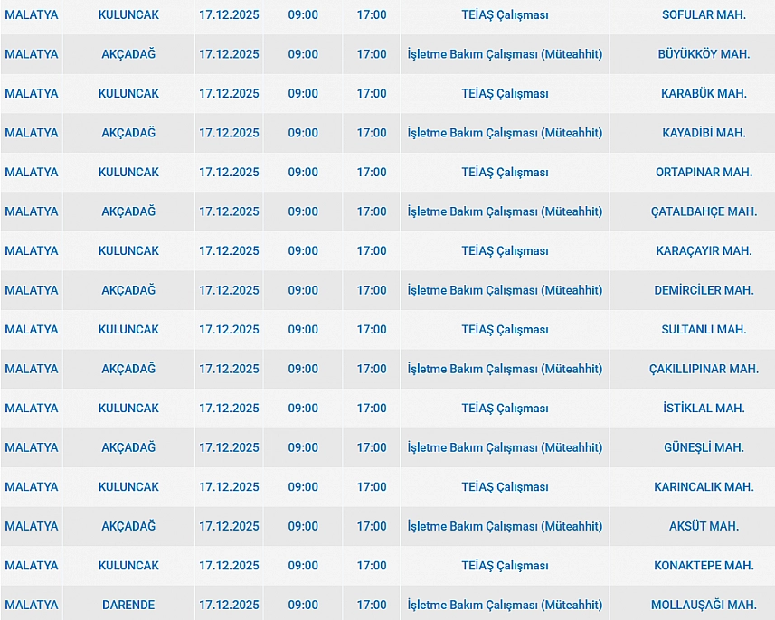 Malatya'da 17 Aralık 2025 Çarşamba günü Hekimhan, Kuluncak, Darende, Doğanşehir, Yeşilyurt, Akçadağ, Battalgazi ilçelerinde planlı bakım çalışmaları nedeniyle elektrik kesintisi yaşanacak. İşte elektrik kesintisi yaşayacak mahalleler…