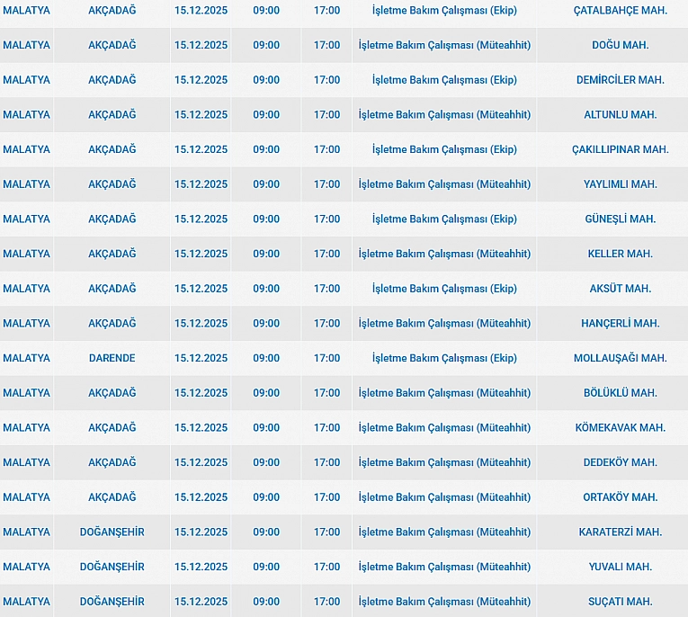 Malatya'da 15 Aralık 2025 Pazartesi günü Akçadağ, Doğanşehir, Darende, Yeşilyurt, Battalgazi, Kuluncak ilçelerinde planlı bakım çalışmaları nedeniyle elektrik kesintisi yaşanacak. İşte elektrik kesintisi yaşayacak mahalleler…