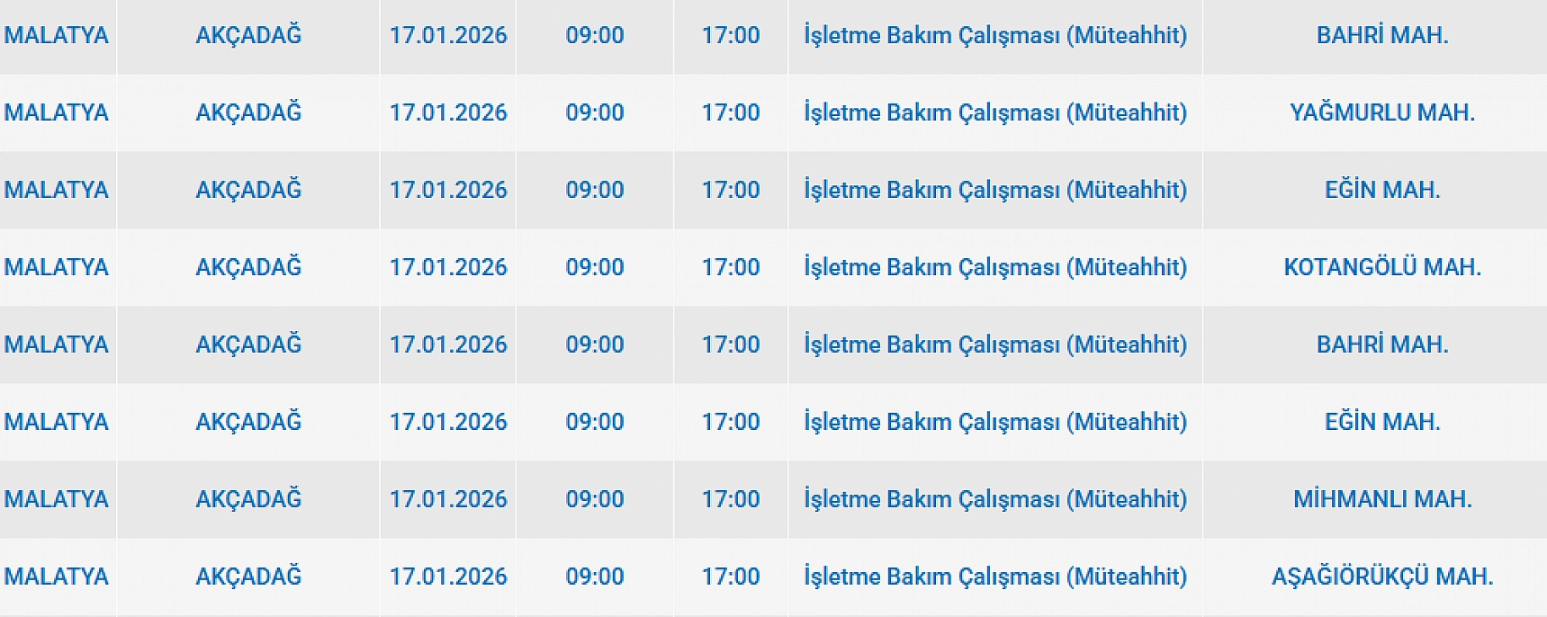 Malatya'da 17 Ocak 2025 Cumartesi günü Akçadağ ilçelerinde planlı bakım çalışmaları nedeniyle elektrik kesintisi yaşanacak. İşte elektrik kesintisi yaşayacak mahalleler…