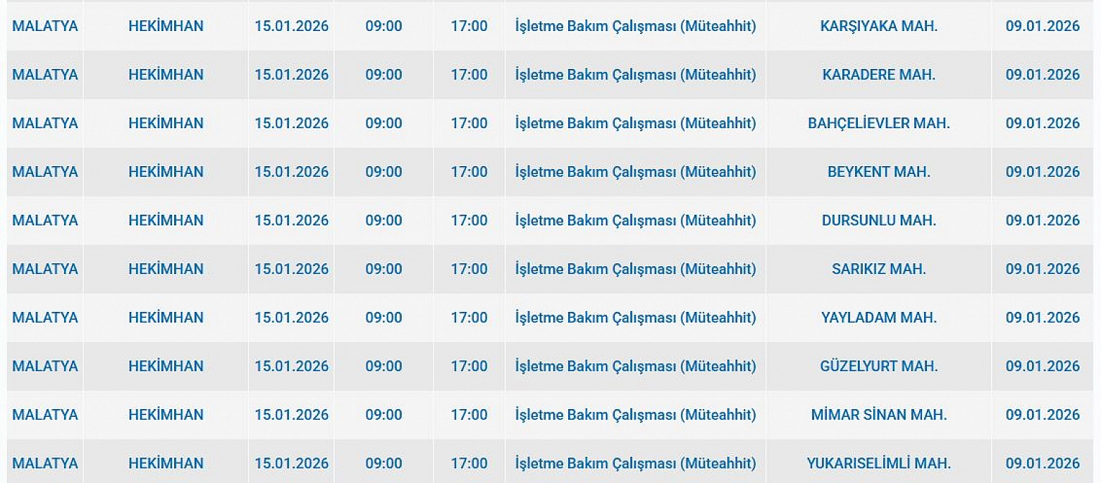 Malatya'da 15 Ocak 2025 Perşembe günü Yeşilyurt, Battalgazi, Kale, Doğanşehir, Darende, Kuluncak ve Hekimhan ilçelerinde planlı bakım çalışmaları nedeniyle elektrik kesintisi yaşanacak. İşte elektrik kesintisi yaşayacak mahalleler…