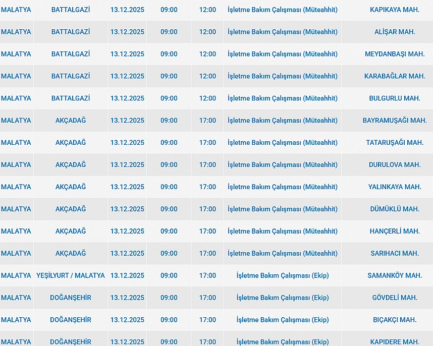 Malatya'da 13 Aralık 2025 Cumartesi günü Darende, Doğanşehir, Akçadağ, Yeşilyurt, Battalgazi, Yazıhan, Darende, Hekimhan, Kale ilçelerinde planlı bakım çalışmaları nedeniyle elektrik kesintisi yaşanacak. İşte elektrik kesintisi yaşayacak mahalleler…