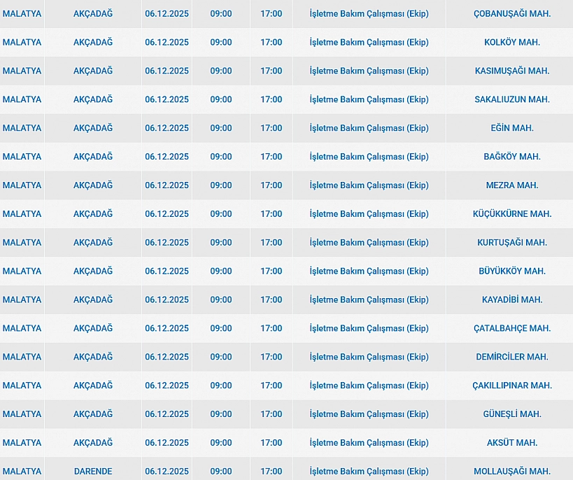Malatya'da 6 Aralık'ta 2025 Cumartesi günü Akçadağ, Darende, Battalgazi, Yeşilyurt, Yazıhan ilçelerinde planlı bakım çalışmaları nedeniyle elektrik kesintisi yaşanacak. İşte elektrik kesintisi yaşayacak mahalleler…