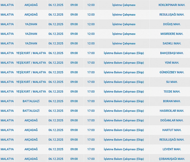 Malatya'da 6 Aralık'ta 2025 Cumartesi günü Akçadağ, Darende, Battalgazi, Yeşilyurt, Yazıhan ilçelerinde planlı bakım çalışmaları nedeniyle elektrik kesintisi yaşanacak. İşte elektrik kesintisi yaşayacak mahalleler…