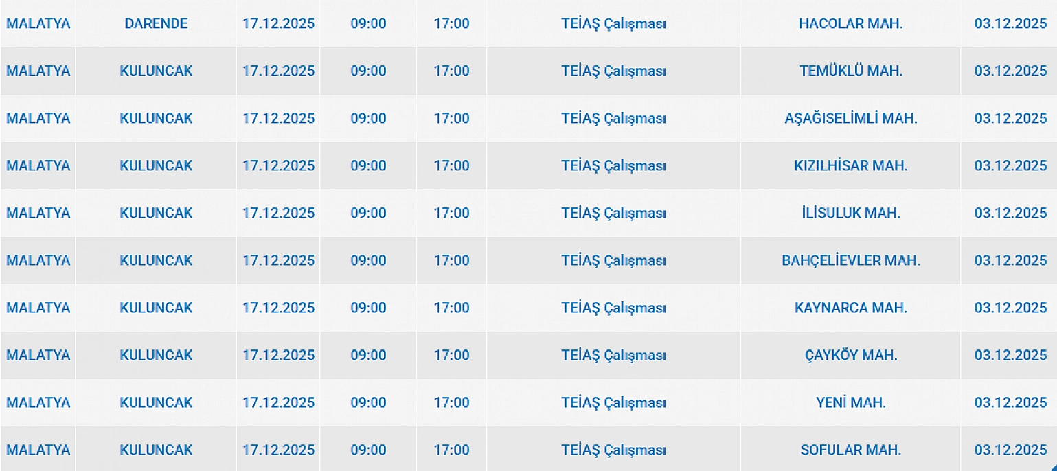 Malatya'da 7 Aralık 2025 Pazar günü Kuluncak, Hekimhan, Darende ilçelerinde planlı bakım çalışmaları nedeniyle elektrik kesintisi yaşanacak. İşte elektrik kesintisi yaşayacak mahalleler…