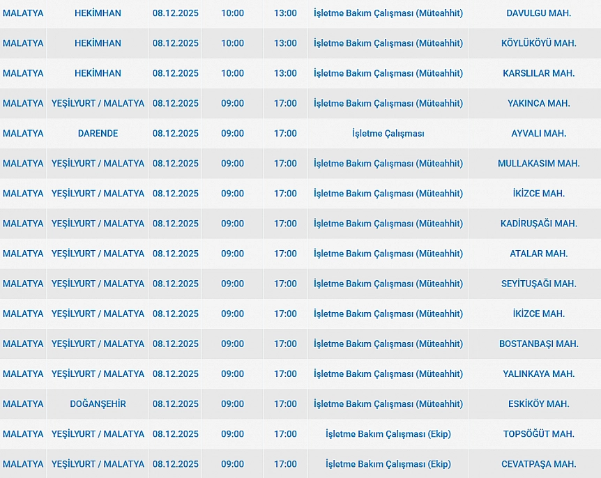 Malatya'da 8 Aralık 2025 Pazartesi günü Yeşilyurt, Akçadağ, Battalgazi, Doğanşehir, Arapgir, Arguvan, Darende, Hekimhan ilçelerinde planlı bakım çalışmaları nedeniyle elektrik kesintisi yaşanacak. İşte elektrik kesintisi yaşayacak mahalleler…