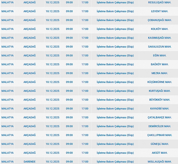 Malatya'da 10 Aralık 2025 Çarşamba günü Darende, Akçadağ, Battalgazi, Doğanşehir ilçelerinde planlı bakım çalışmaları nedeniyle elektrik kesintisi yaşanacak. İşte elektrik kesintisi yaşayacak mahalleler…