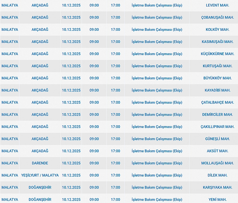 Malatya'da 10 Aralık 2025 Çarşamba günü Darende, Akçadağ, Battalgazi, Doğanşehir ilçelerinde planlı bakım çalışmaları nedeniyle elektrik kesintisi yaşanacak. İşte elektrik kesintisi yaşayacak mahalleler…