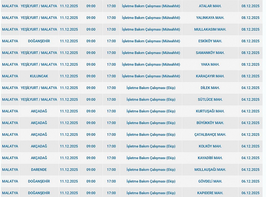Malatya'da 11 Aralık 2025 Perşembe günü Doğanşehir, Akçadağ, Pütürge, Yeşilyurt, Darende, Kuluncak ilçelerinde planlı bakım çalışmaları nedeniyle elektrik kesintisi yaşanacak. İşte elektrik kesintisi yaşayacak mahalleler…