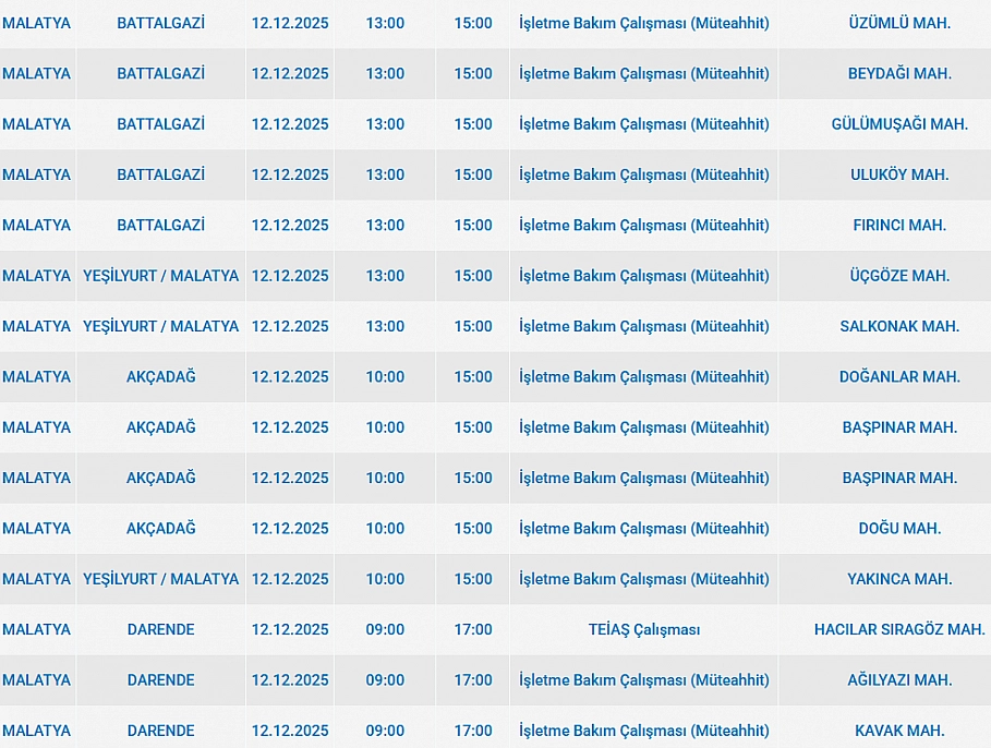 Malatya'da 12 Aralık 2025 Cuma günü Hekimhan, Darende, Yeşilyurt, Akçadağ, Battalgazi, Doğanşehir ilçelerinde planlı bakım çalışmaları nedeniyle elektrik kesintisi yaşanacak. İşte elektrik kesintisi yaşayacak mahalleler…