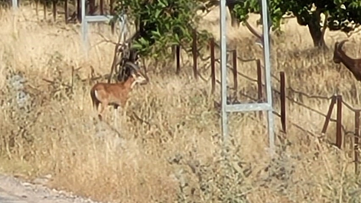 Ilıcak Mahallesinde Uğur Hanbey Aladağ’a ait kayısı bahçesinde görüntülenen iki yaban keçisi vatandaşların fark edilmesinin ardından dağlık alanlara kayalık doğru kaçarak bölgeden uzaklaştı.