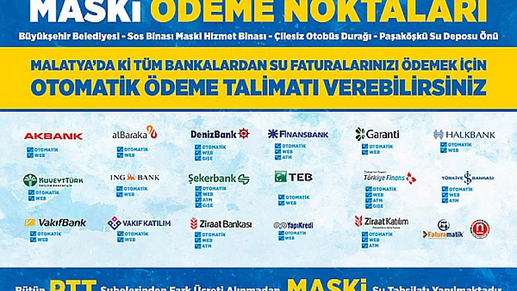 Malatya Büyükşehir Belediyesi Su ve Kanalizasyon İdaresi (MASKİ) Genel Müdürlüğü vatandaşlara fatura ödeme kolaylığı sağlıyor.