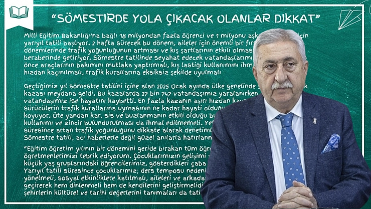 Yarıyıl tatilinin başlamasıyla birlikte milyonlarca aile de yollara çıkmaya hazırlanıyor. Türkiye Esnaf ve Sanatkarları Konfederasyonu (TESK) Genel Başkanı Bendevi Palandöken, tatil dönemlerinde artan trafik yoğunluğuna ve kış şartlarının oluşturduğu risklere dikkat çekerek, sürücülerin araç bakımlarını yaptırmaları, kış lastiği kullanmaları ve trafik kurallarına titizlikle uymaları gerektiğini vurguladı.