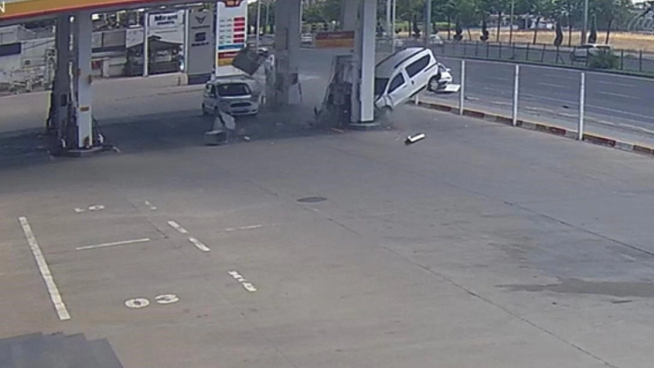 Diyarbakır'ın Yenişehir ilçesinde çarpışan iki araçtan birinin petrol istasyonuna dalma anı güvenlik kamerasına yansıdı.