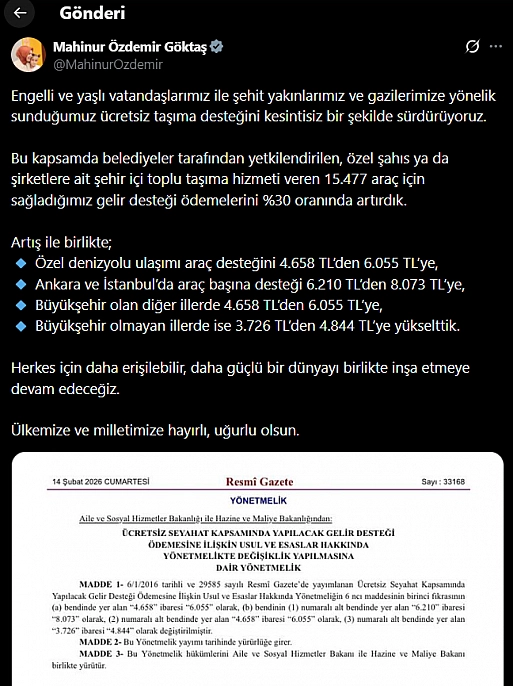 Cumhurbaşkanı Recep Tayyip Erdoğan imzasıyla Resmi Gazete'de yayımlanarak yürürlüğe giren yeni düzenleme engelli, yaşlı, şehit yakınları ve gazilerin ücretsiz seyahat hakkı kapsamında toplu taşıma araçlarına sağlanan gelir desteği ödemelerini yüzde 30 oranında artırıldı.