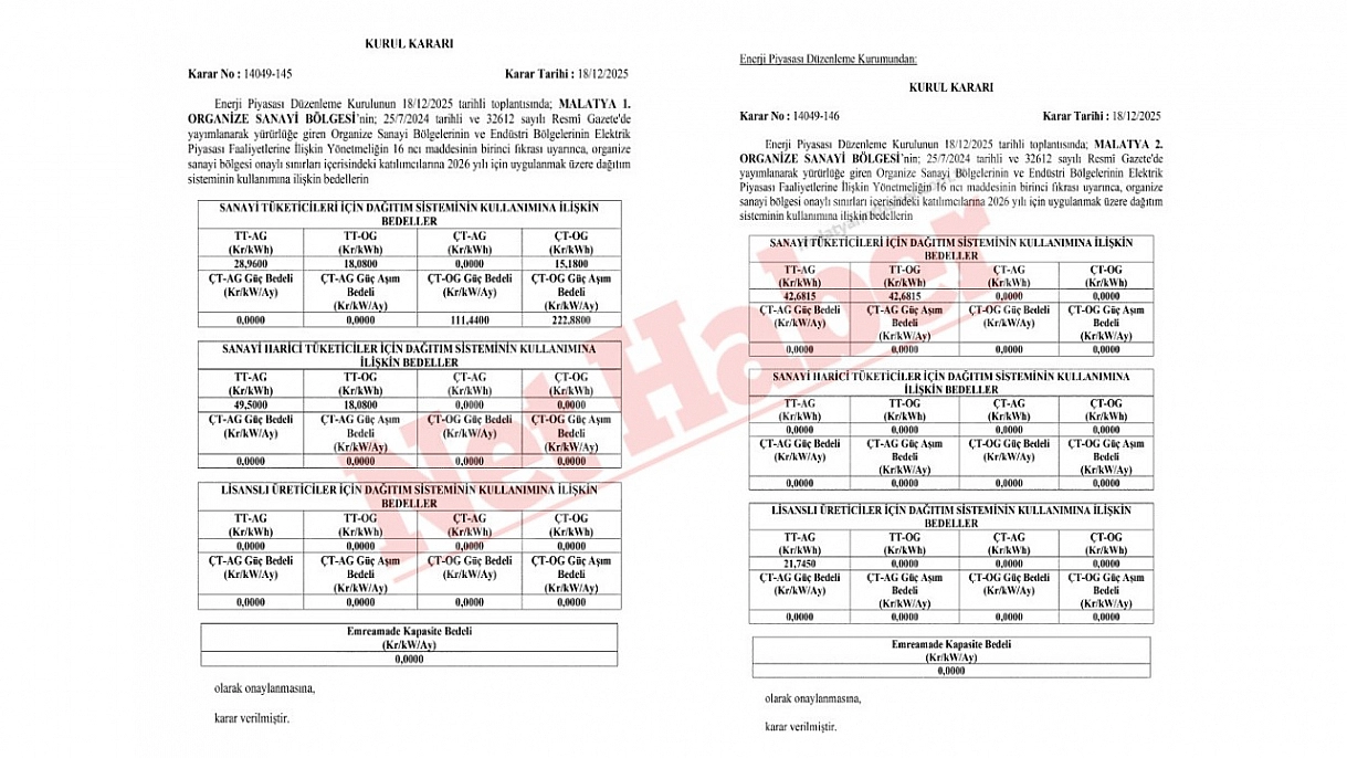 Cumhurbaşkanı Recep Tayyip Erdoğan imzasıyla Resmi Gazete'de yayımlanan karar ile Enerji Piyasası Düzenleme Kurumu (EPDK), Türkiye genelindeki 218 organize sanayi bölgesi arasında Malatya'nın 1. ve 2. Organize Sanayi bölgeleri için 2026 yılı elektrik dağıtım bedellerini açıkladı.