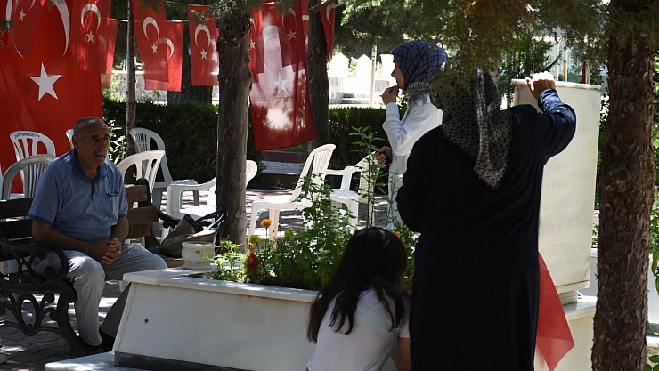 Şehitlikte yakınlarının kabirlerini ziyaret eden vatandaşlar dua etti.