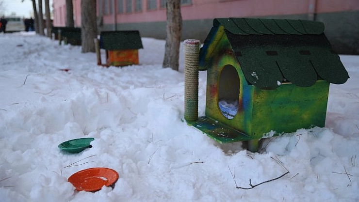 Kurum bahçesinde çeşitli noktalara yerleştirilen, içerisinde minder, önünde yemek kabı bulunan kedi evleri ile ağaçlara asılan kuş yuvaları, hayvanlara sıcak ortam sağladı.