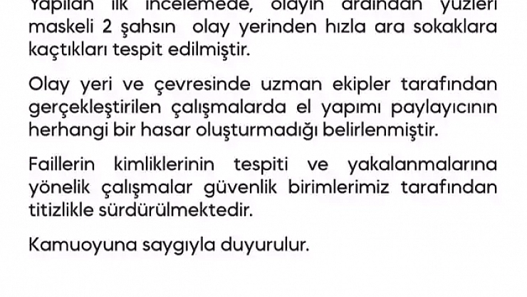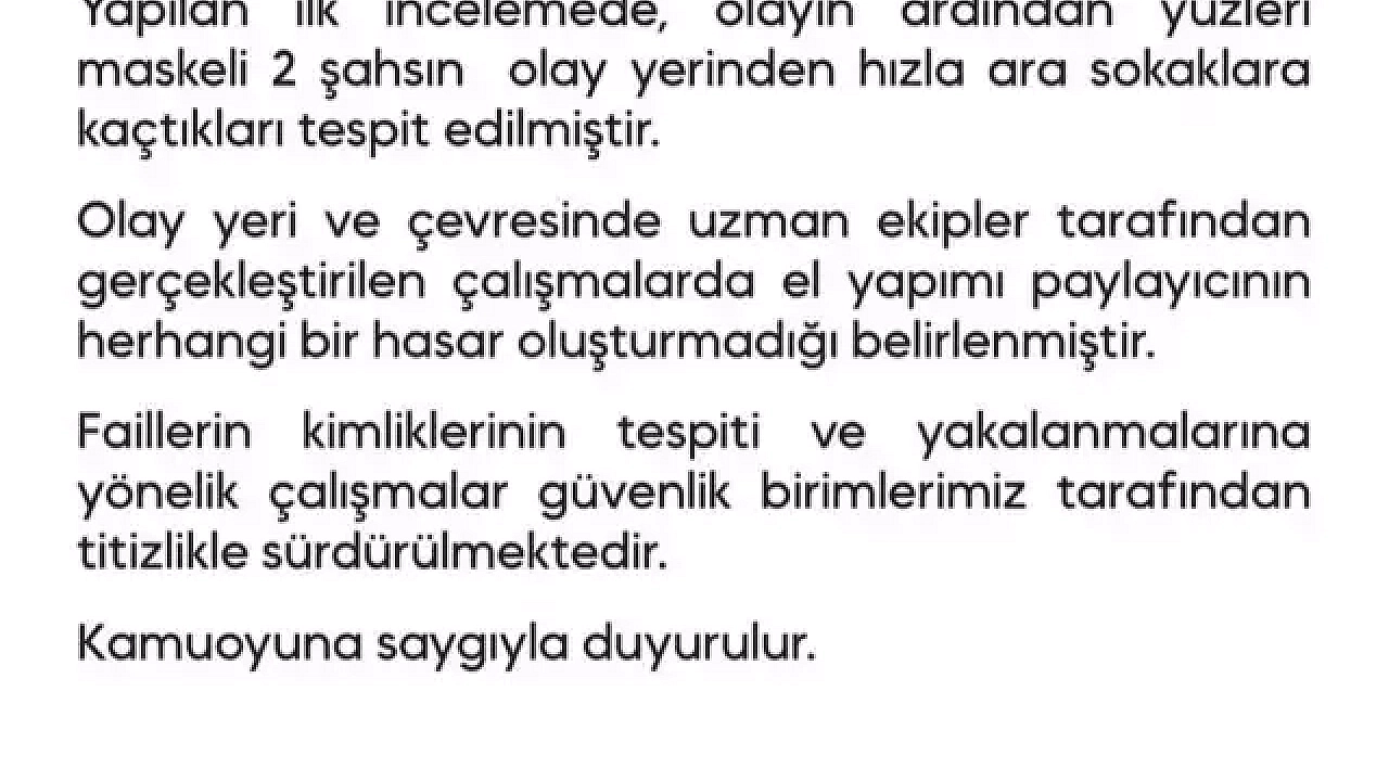 VALİLİK: HERHANGİ BİR HASAR YOK, MASKELİ 2 ŞÜPHELİ ARANIYOR