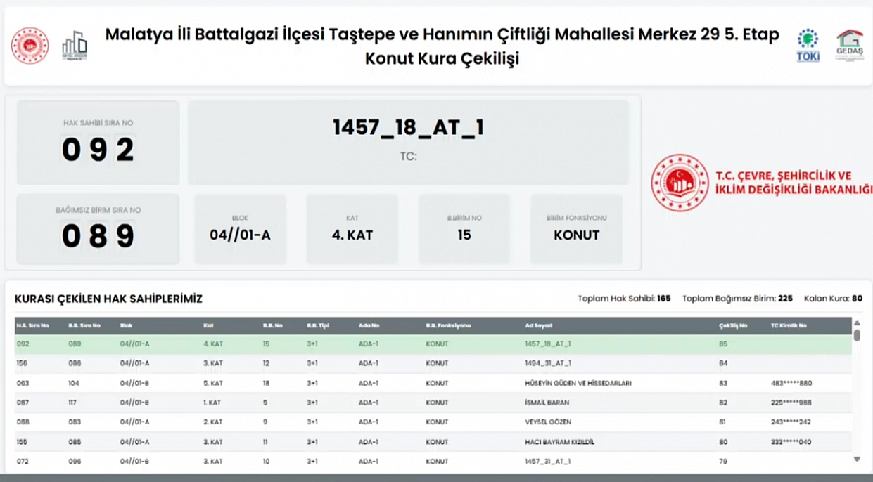 Malatya'da 6 Şubat 2023'teki depremlerde yıkılan veya ağır hasar gören ve yapımı tamamlanan konutların kurası çekiliyor. Merkez 29-5. Etap Projesi kapsamında Taştepe Mahallesi'nde 165 konutun kura sonuçları belli oldu.