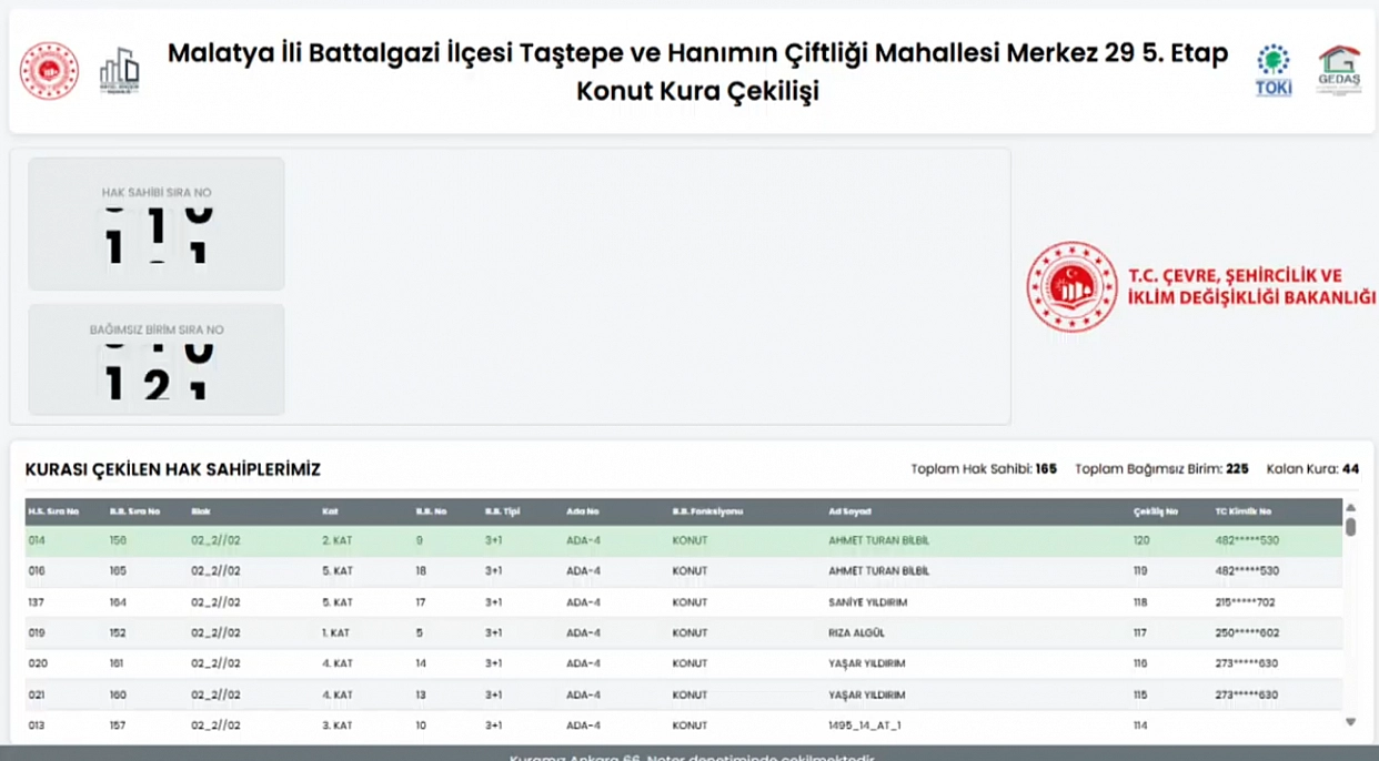 Malatya'da 6 Şubat 2023'teki depremlerde yıkılan veya ağır hasar gören ve yapımı tamamlanan konutların kurası çekiliyor. Merkez 29-5. Etap Projesi kapsamında Taştepe Mahallesi'nde 165 konutun kura sonuçları belli oldu.