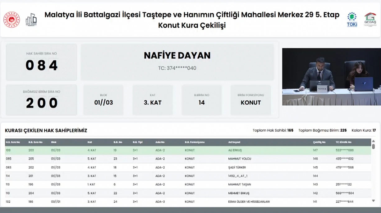 Malatya'da 6 Şubat 2023'teki depremlerde yıkılan veya ağır hasar gören ve yapımı tamamlanan konutların kurası çekiliyor. Merkez 29-5. Etap Projesi kapsamında Taştepe Mahallesi'nde 165 konutun kura sonuçları belli oldu.