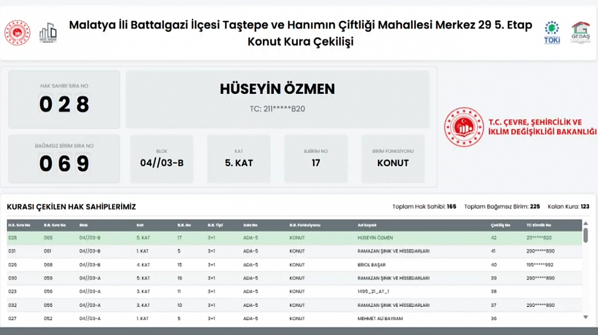 Malatya'da 6 Şubat 2023'teki depremlerde yıkılan veya ağır hasar gören ve yapımı tamamlanan konutların kurası çekiliyor. Merkez 29-5. Etap Projesi kapsamında Taştepe Mahallesi'nde 165 konutun kura sonuçları belli oldu.
