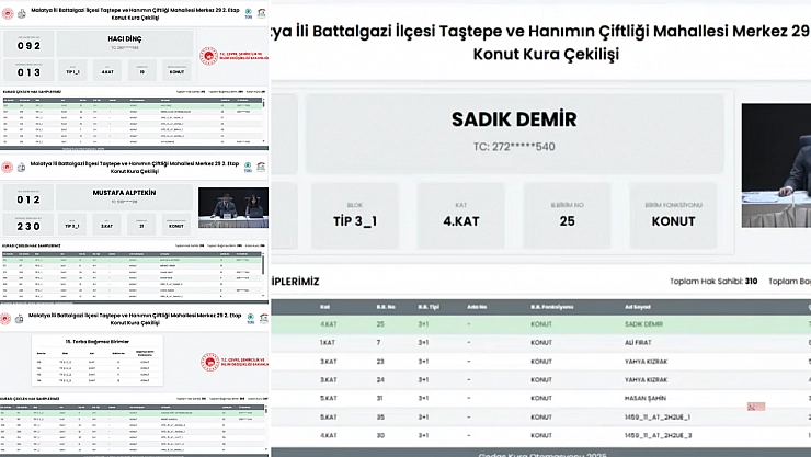 Malatya'da 6 Şubat 2023'teki depremlerde yıkılan veya ağır hasar gören ve yapımı tamamlanan konutların kurası çekiliyor. Merkez 29-2. Etap Projesi kapsamında Taştepe ve Hanımınçiftliği Mahallelerinin 310 konutun kura sonuçları belli oldu.